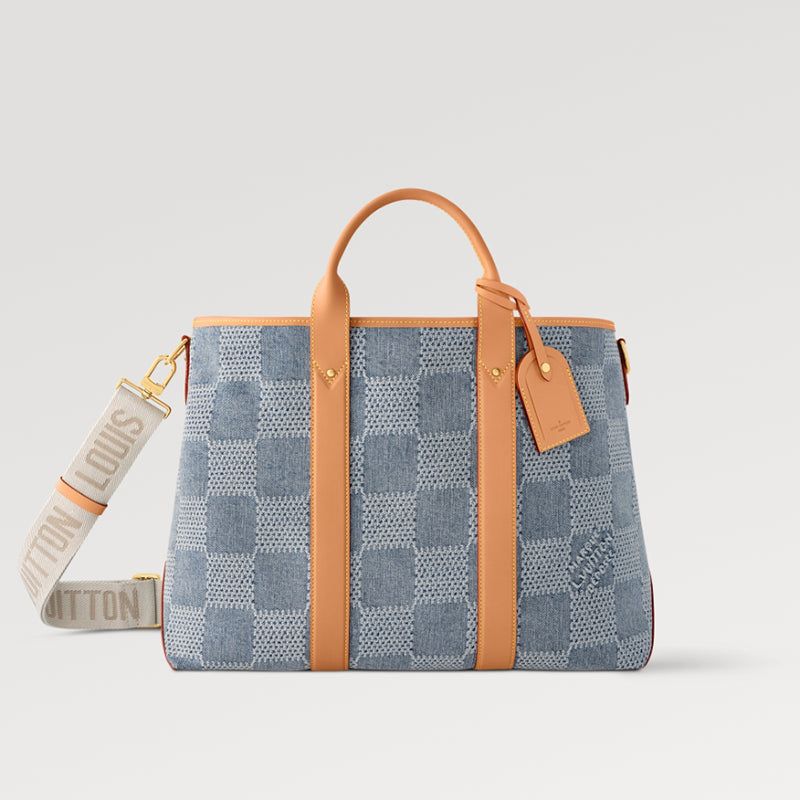 • メゾンならではのディテールを散りばめた、エレガントな「ウィークエンド・トートNM」。ファレル・ウィリアムスが手掛けたダミエ・デニム 3D コットンキャンバスで仕立て、ヌメ革のトップハンドルとサイドバンドをあしらいました。GOTS認証済みのオーガニックコットンを使用し、ファレルお気に入りのルイ・ヴィトンの定番である市松模様のパターンがデニムで再解釈されています。