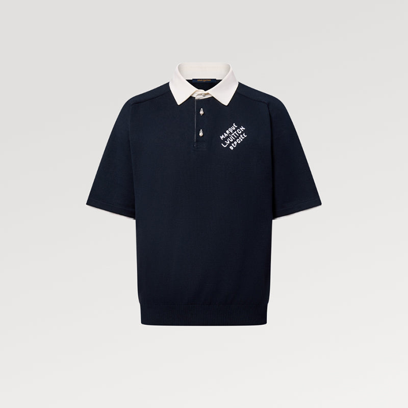 • 上質なコットン混紡素材で編んだこのポロシャツは、ドレスシャツの襟で仕立てられています。フロントに Marque L.Vuitton déposée のロゴが刺繍され、上部には LV イニシャルをあしらったパール光沢のあるボタンが付いており、クラシックなマリンルックに簡単にマッチします。