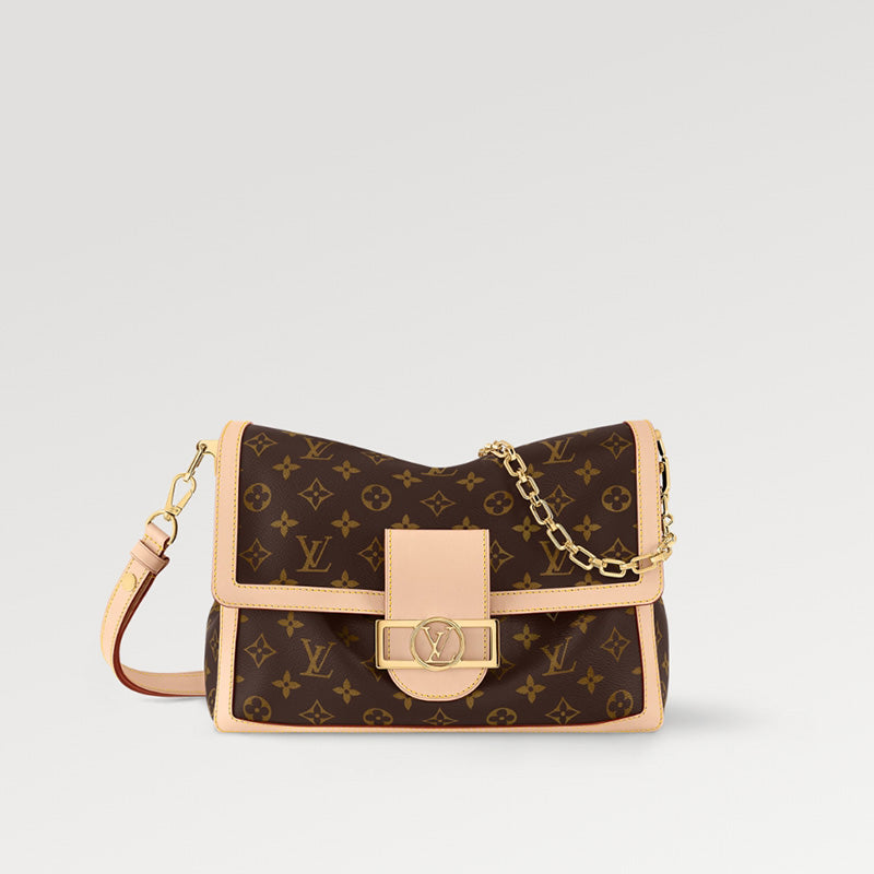 • モノグラム・キャンバスにヌメ革のトリミングを施した新たな「ドーフィーヌ・ソフト GM」は、そのしなやかな構造でこの上なく快適に持ち運びが可能。2024春夏ファッションショーに登場したアイテムです。エンブレマティックなLV サークルを配した長方形のロックや、いずれも取外し可能なゴールドカラーのチェーンとショルダーストラップなど、クラシカルな「ドーフィーヌ」ならではのディテールをあしらいました。